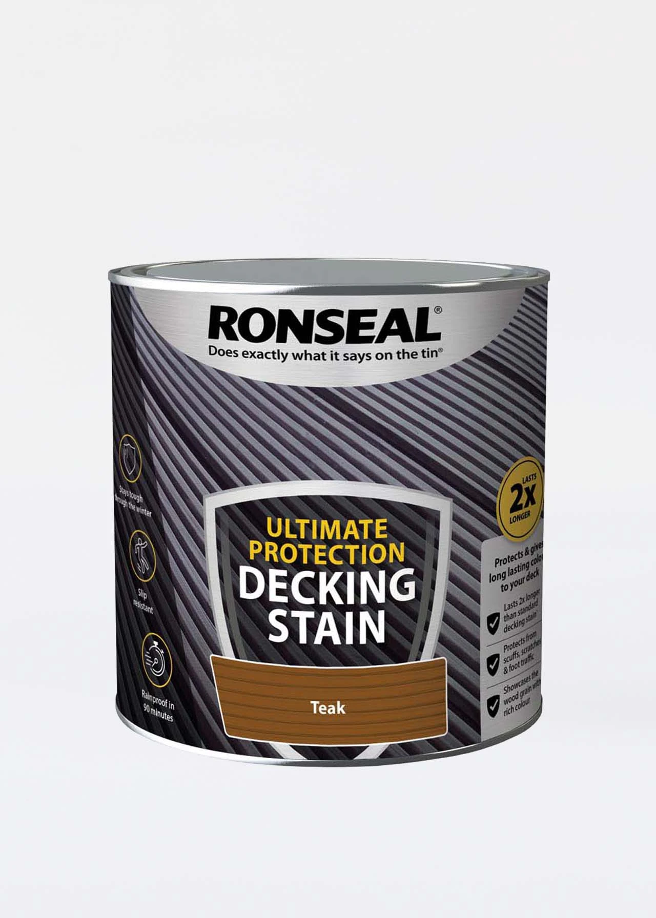 The Ronseal Ultimate Protection Decking Stain is the best choice if you’re looking for a long-lasting finish. It protects against harsh weather and people walking on it. It’ll last twice as long as standard decking stains, keeping your decking looking good all year round.