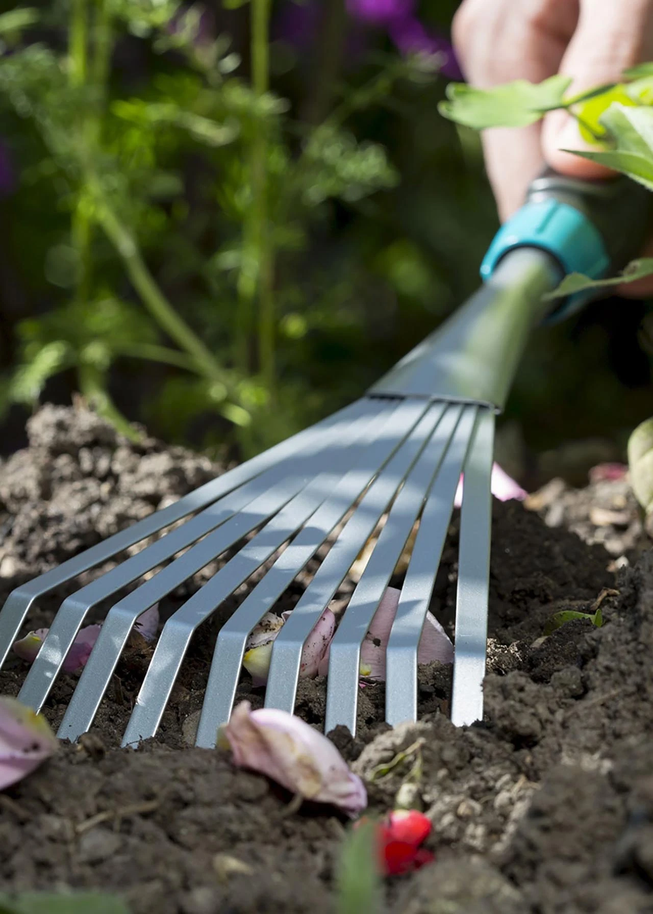 Perfect for raking leaves, weeds and grass cuttings in small flower beds and hard to reach areas. The GARDENA Comfort Hand Rake is coated with specially designed DuroPlast to prevent rusting.