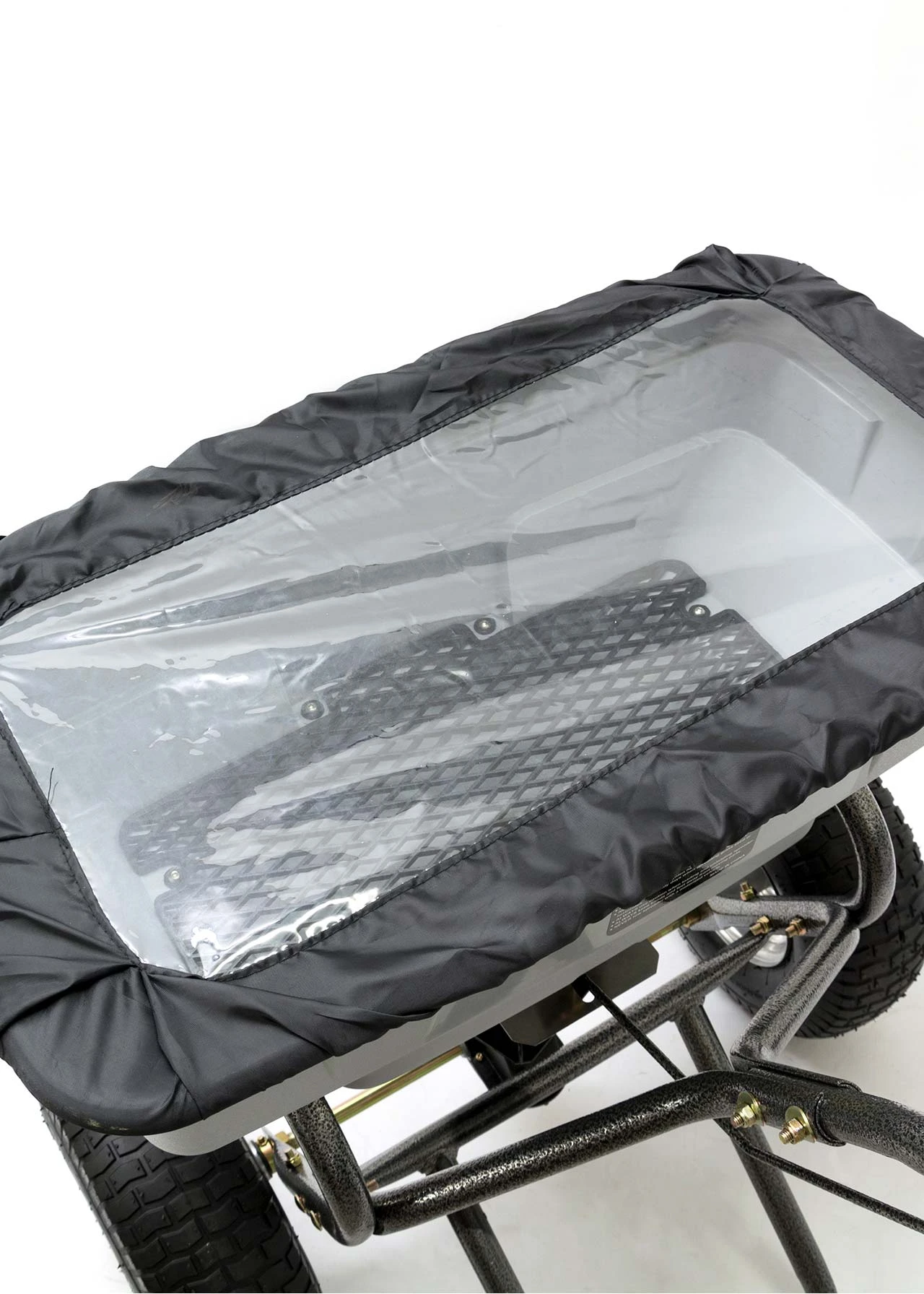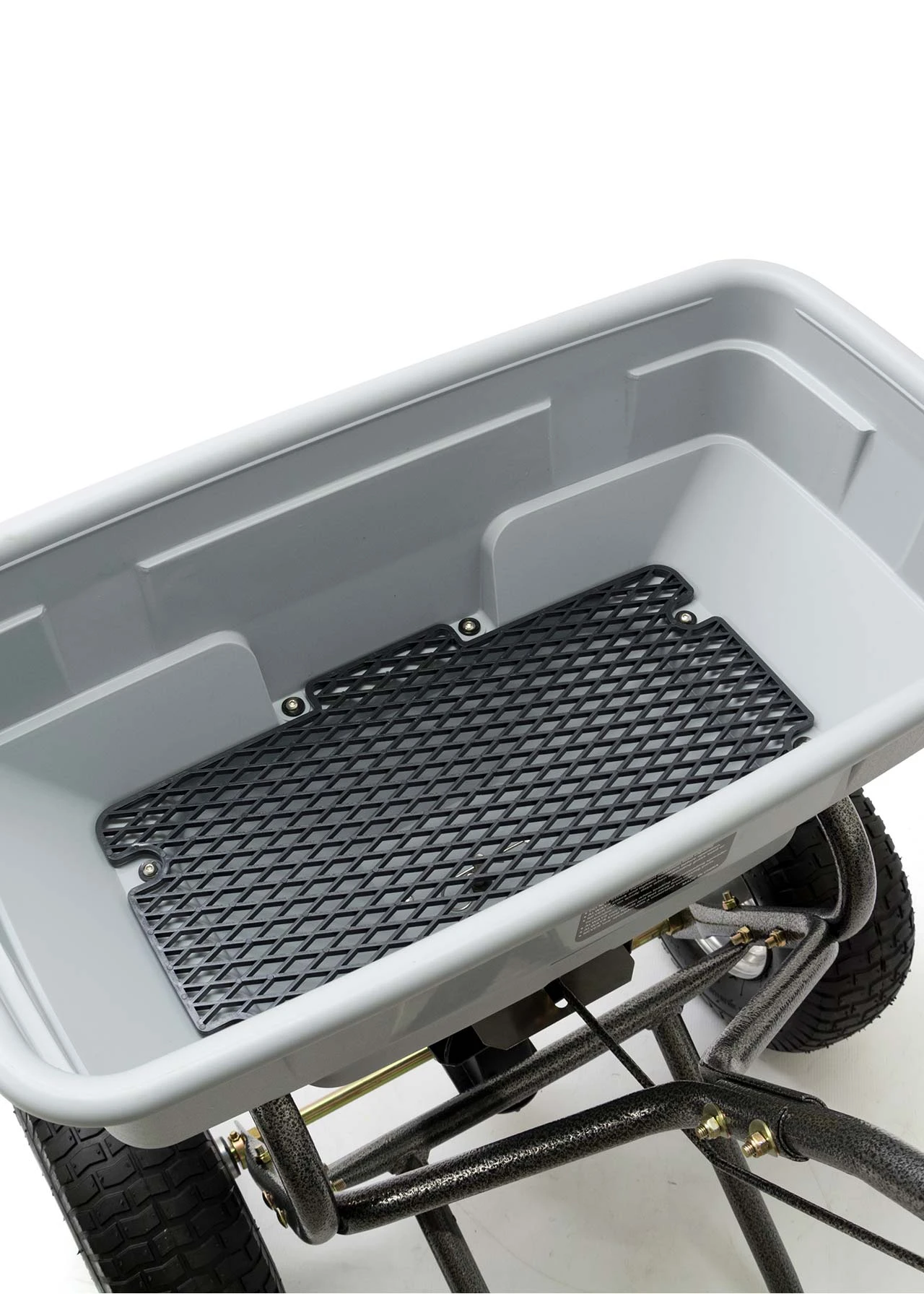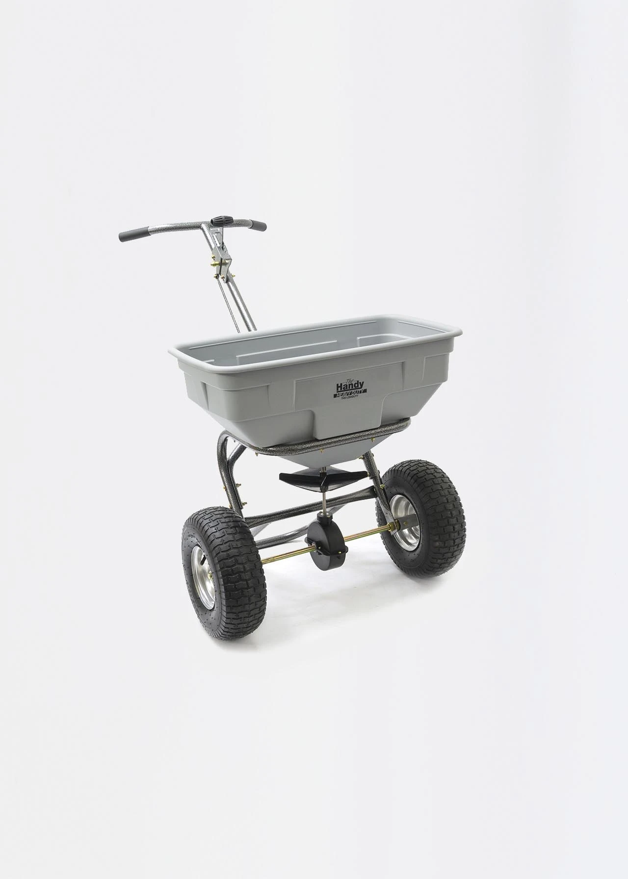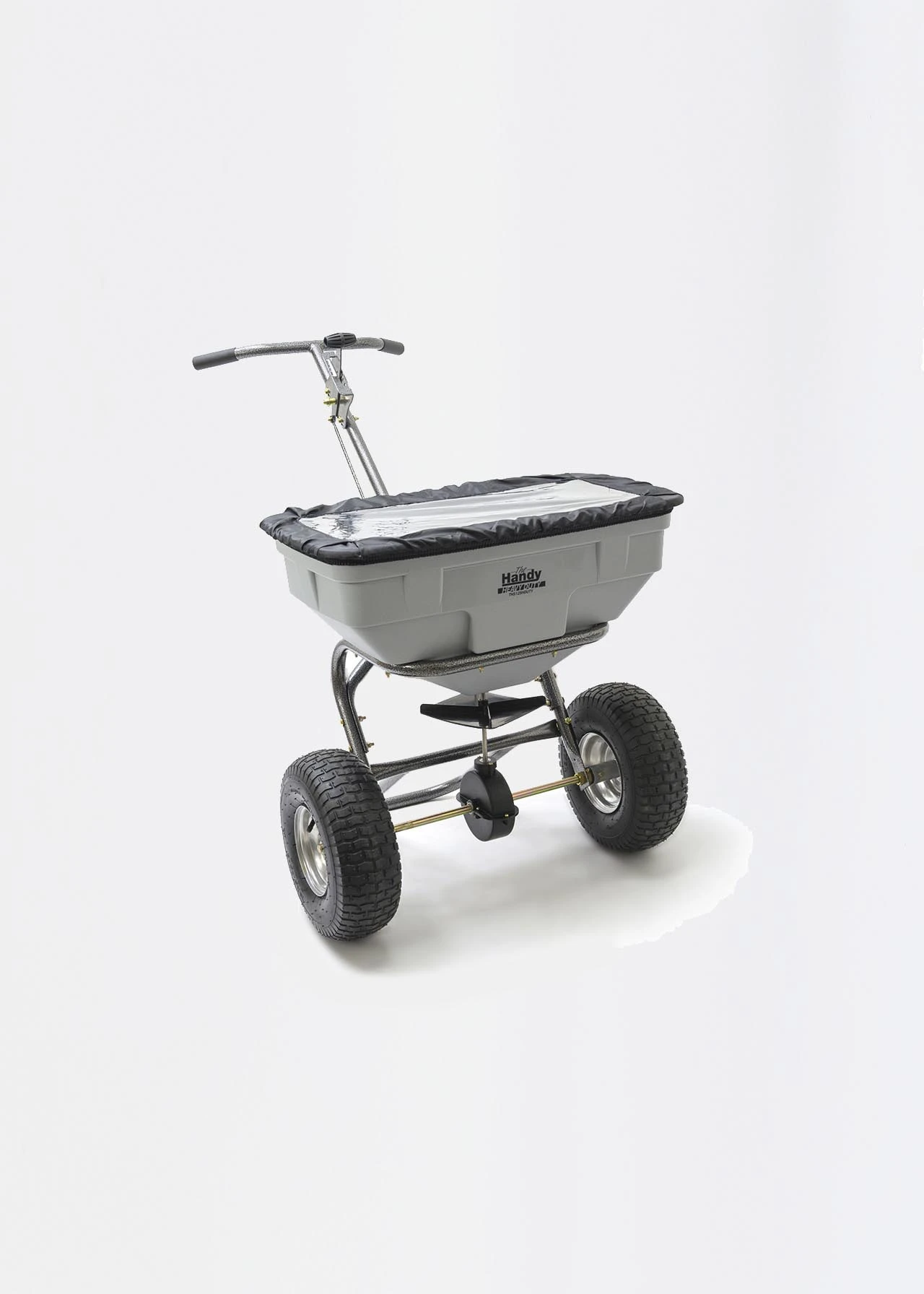 Heavy duty 125lbs capacity broadcast spreader from Handy. The THS125HDUTY is a walk behind spreader built for fertiliser granules or grass seed. With a 10 – 12ft spreading width the THS125HDUTY is able to cover a large area quickly. It has been fitted with a heavy duty gearbox and the feed control is adjustable via a lever on the handles. The durable poly hopper is rust-proof and has a rain cover and screen so can be used in all weathers. It can also be used for salt spreading over paths and drives. Large pneumatic tyres allow the spreader to be handled easily over steps or rougher ground.