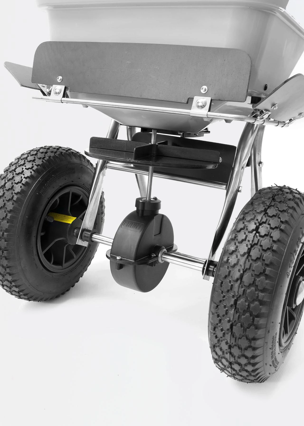 It has a spread width of 10-12 feet and 12″ pneumatic wheels which enable easy manoeuvrabilty over uneven terrain. The broadcast spreader comes complete with hopper screen and vinyl hopper cover.