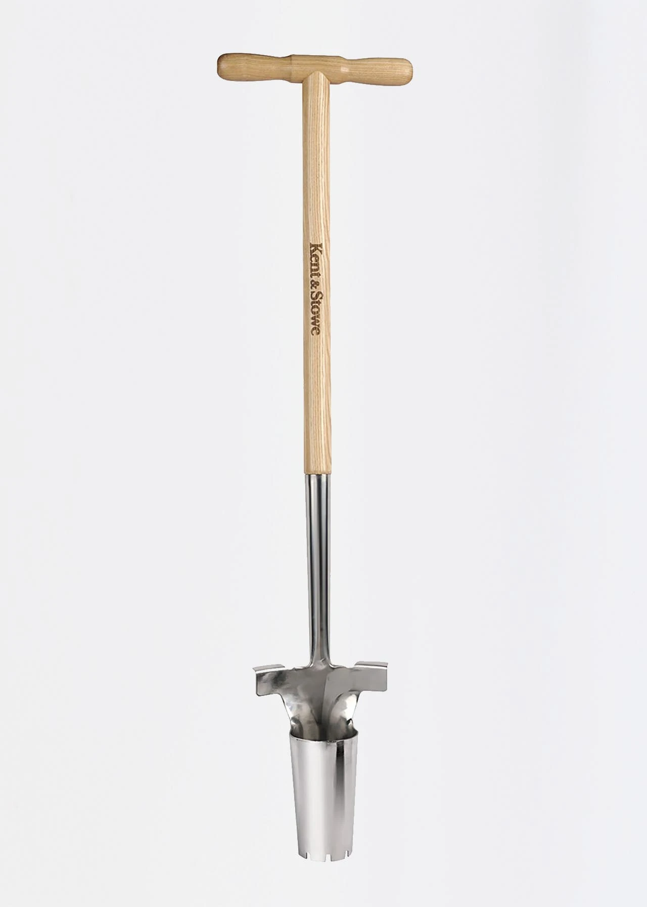 Crafted with a beautiful ash wood handle this long handled bulb planter is shaped for comfort.
