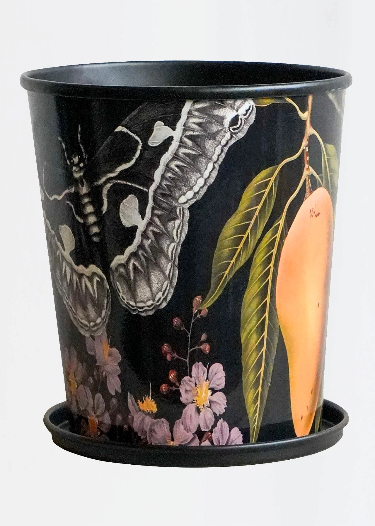 In statement black with a romantic archival Royal Botanic Gardens Kew print, this metal planter and saucer is hand made in India and is sure to transform your home.