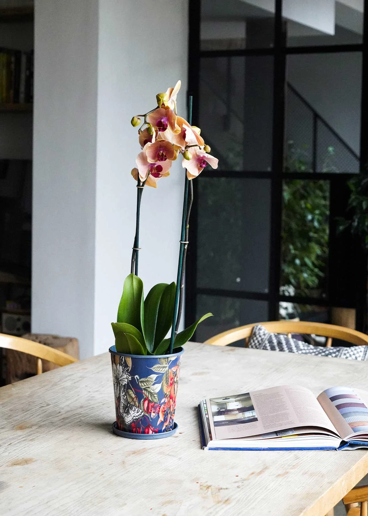 The Kew Temperate House Planter With Saucer has a moody colour palette and archival Royal Botanic Gardens, Kew print.