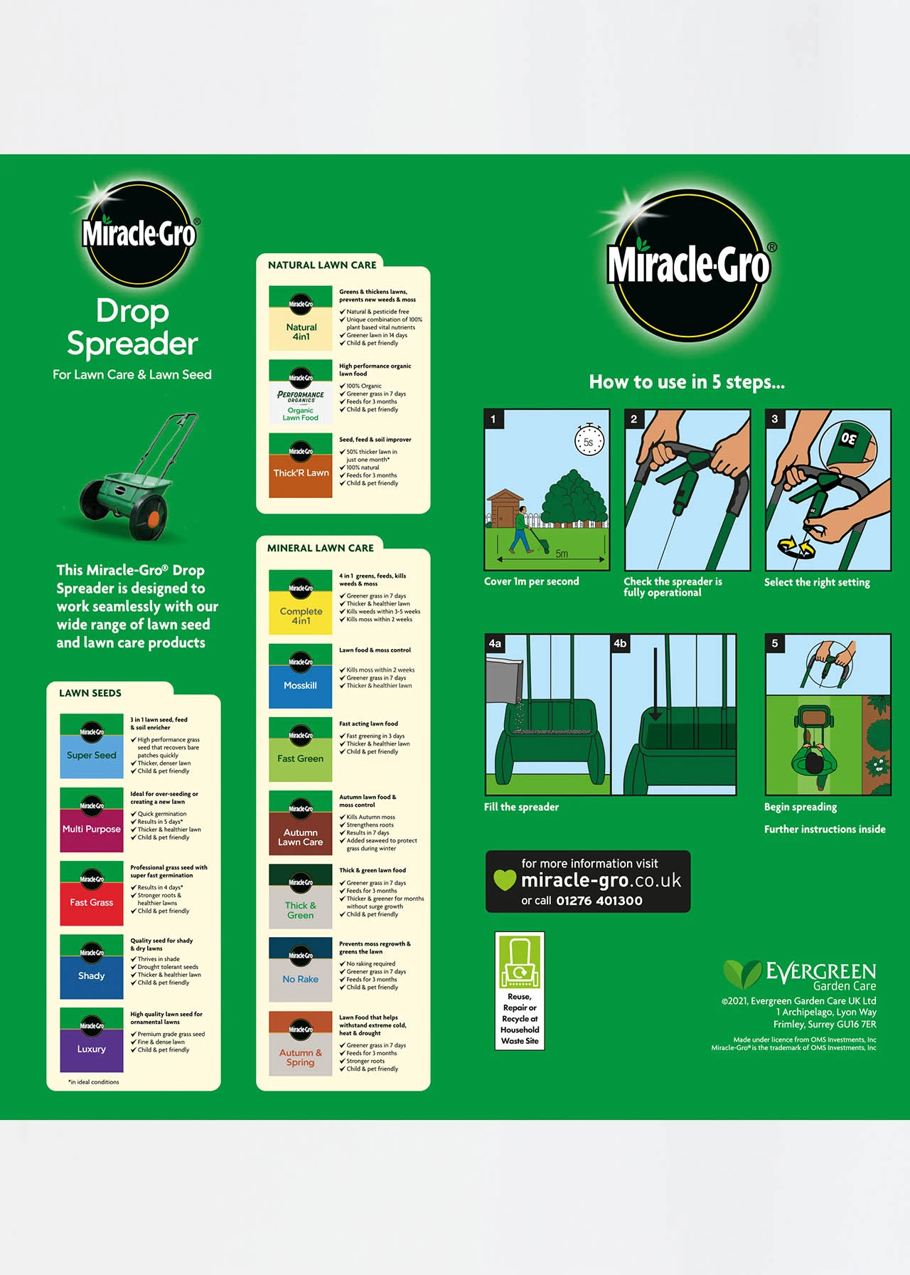 The Miracle-Gro Drop Spreader has variable settings to apply lawn food or grass seed. For best results use with Miracle-Gro granular lawn treatments and/or grass seed products.