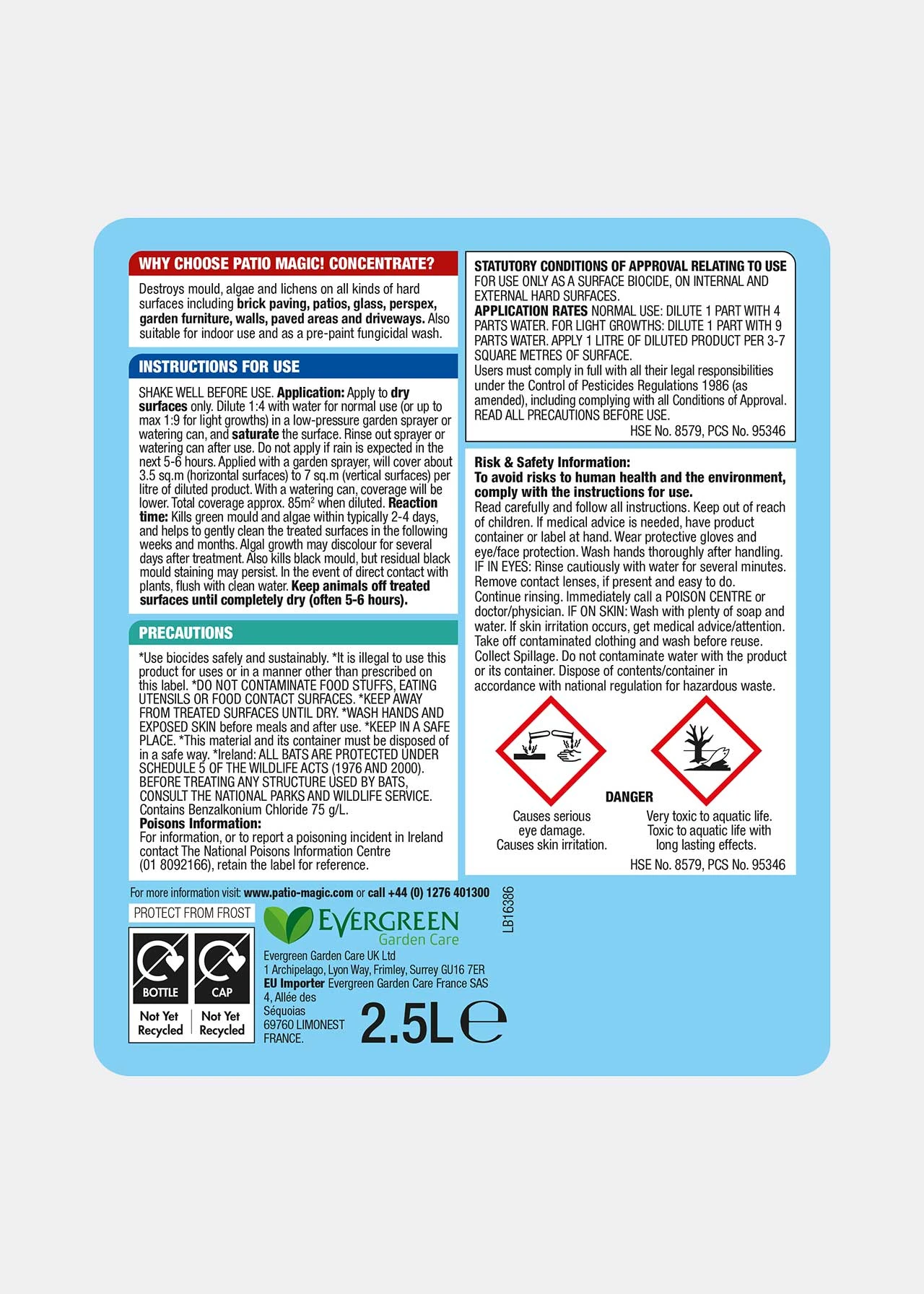 Patio Magic! is a concentrated disinfectant for the easy treatment, removal and prevention of green mould and algae on hard surfaces. Suitable for patios, driveways, paths, fencing, decking and conservatories. Requires no elbow grease, simply dilute and apply with a watering can or pressure sprayer. Also suitable for indoor use, and as a pre-fungicidal wash.