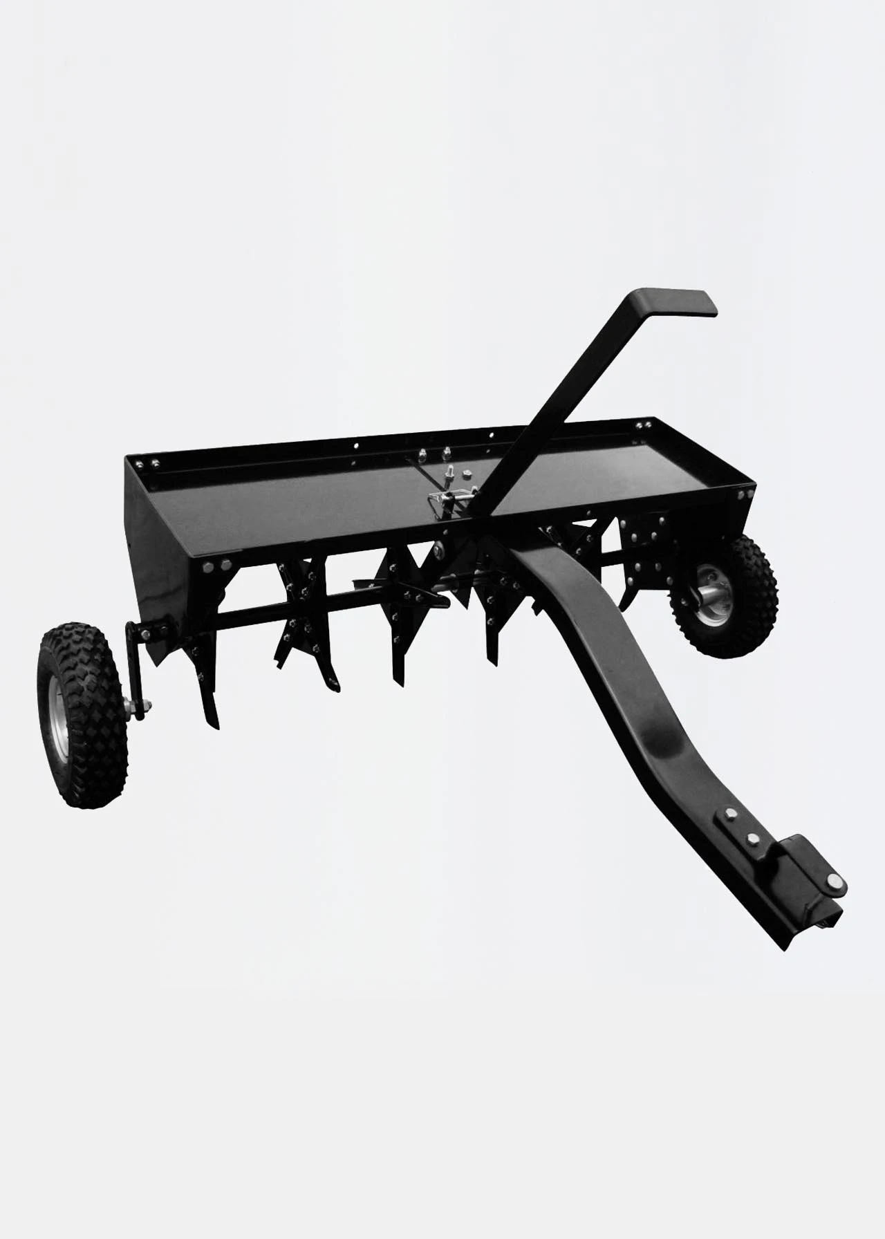The Handy 40in Plug Aerator is made from black powder-coated steel in black, the plug aerator is towed by your garden tractor. It has a convenient weight tray that will enable you to add weight as required for optimum performance. Itβs 24 replaceable hollow core tines will penetrate your grass area by up to 3″, with a 102cm (40in) working width. The THTPA40 aerator has been equipped with 10″ pneumatic tyres for easy transportation, a single cantilevered handle allows you to quickly adjust from working to transportation. The best time to use the aerator is when the turf has a high moisture content, using the tow-behind plug aerator will allow air, moisture and nutrients access to the grasses root system, along with reducing the compaction of the soil. The Aerator is supplied with a universal hitch pin and suitable for use with most makes of ride-on mowers or lawn tractors.