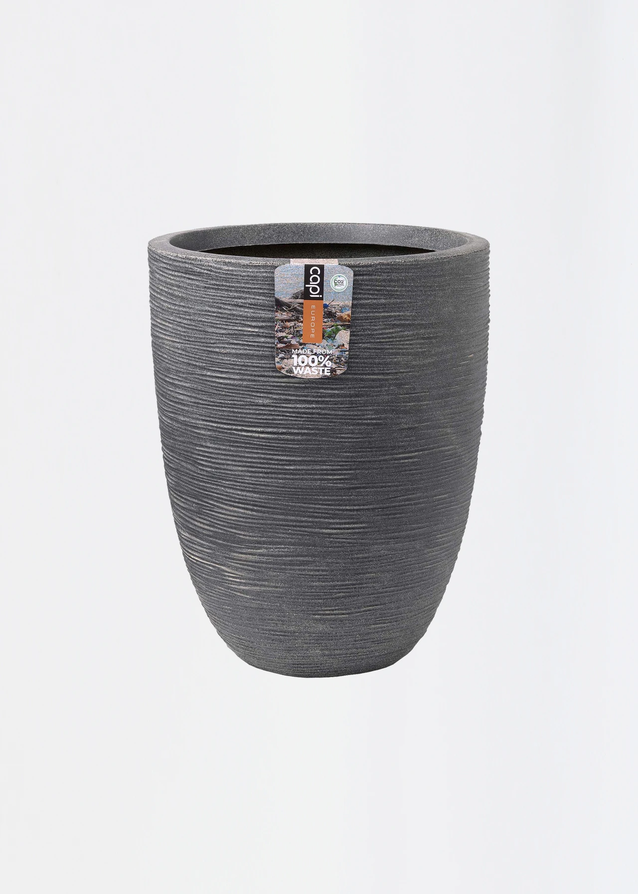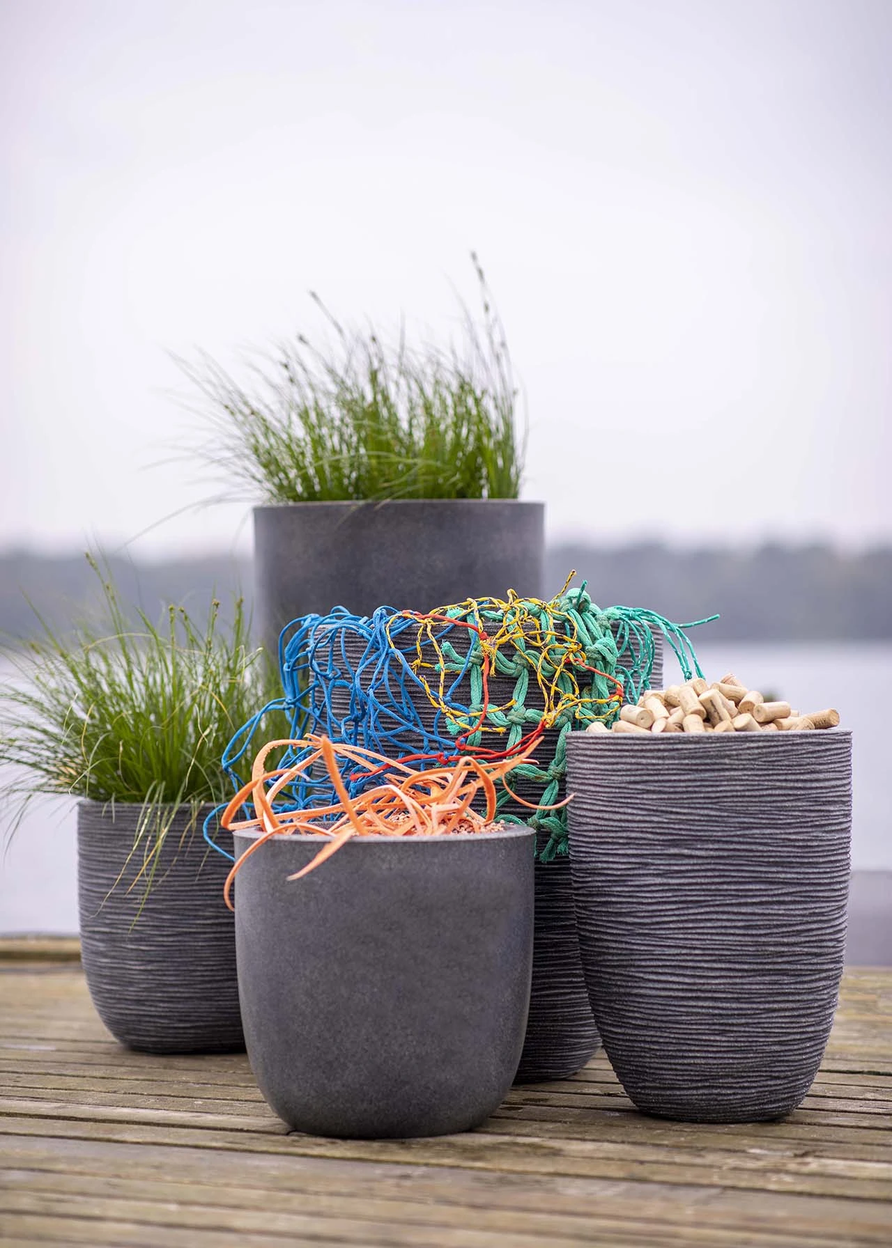 This ribbed planter is produced CO2 neutral in the Netherlands and made from 100% waste; fishing nets, used corks and recycled Capi planters. The Rib-texture gives the planter a natural look. The Rib’s texture is inspired by wickerwork with its elegant lines. Besides the natural look, the small, dancing lines provide a playful touch to these Capi pots.