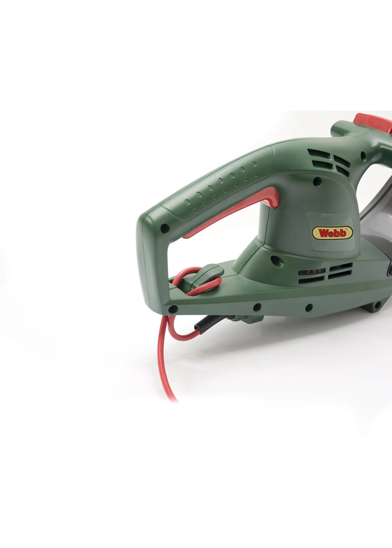 Enjoy superb handling, excellent cutting-capability and powerful performance with this sleek, ergonomically-optimised electric hedgetrimmer from venerable UK brand Webb! Its efficient 500w motor drives a highly-productive 51cm diamond-ground blade set thats double-sided for speedy bi-lateral trimming; and which combines a dual-reciprocating action with a sizeable 18mm tooth-pitch to ensure a clean, bruise-free cut with no stalling-issues.