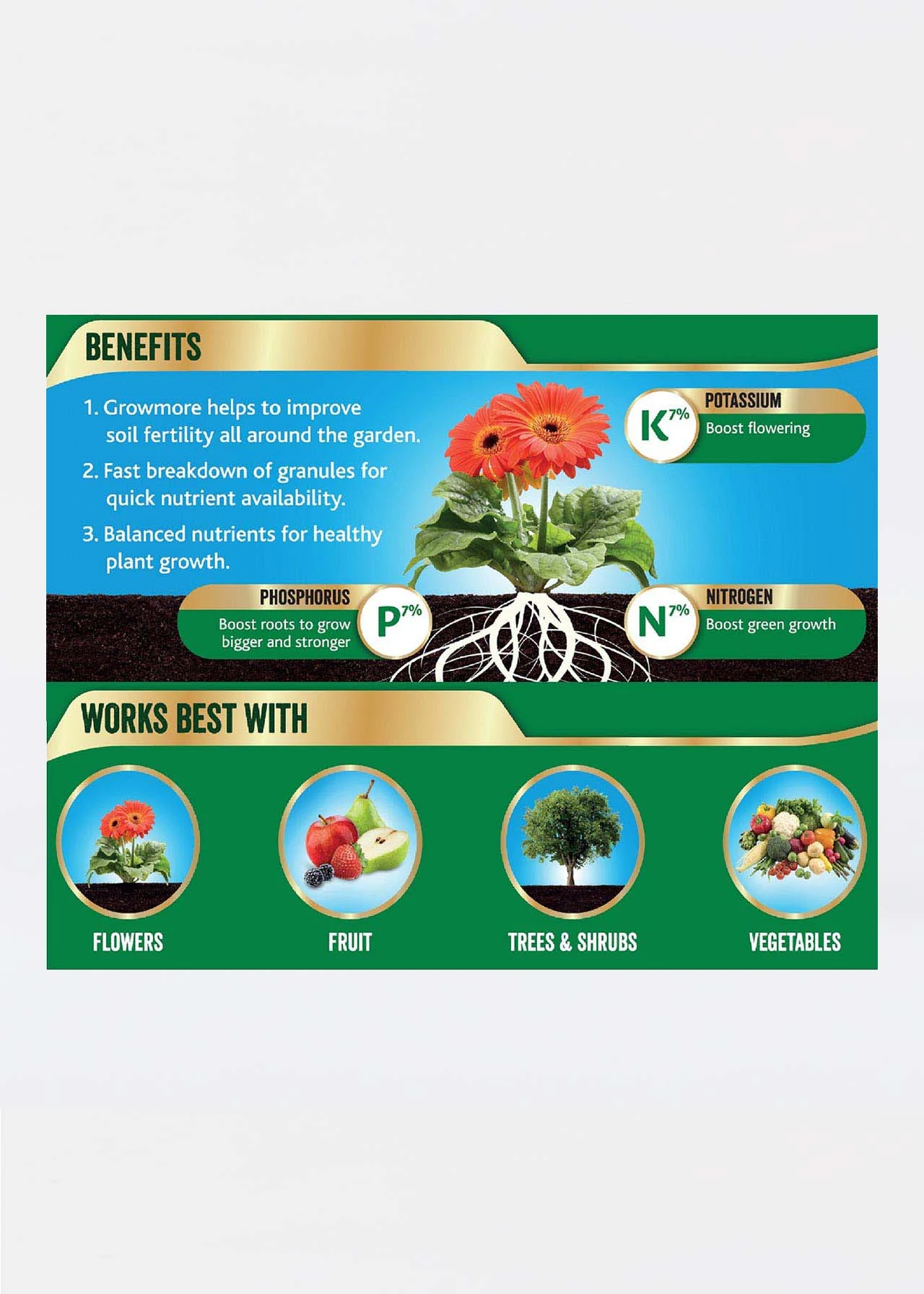 Westland Growmore provides the three major plant nutrients in equal proportions.