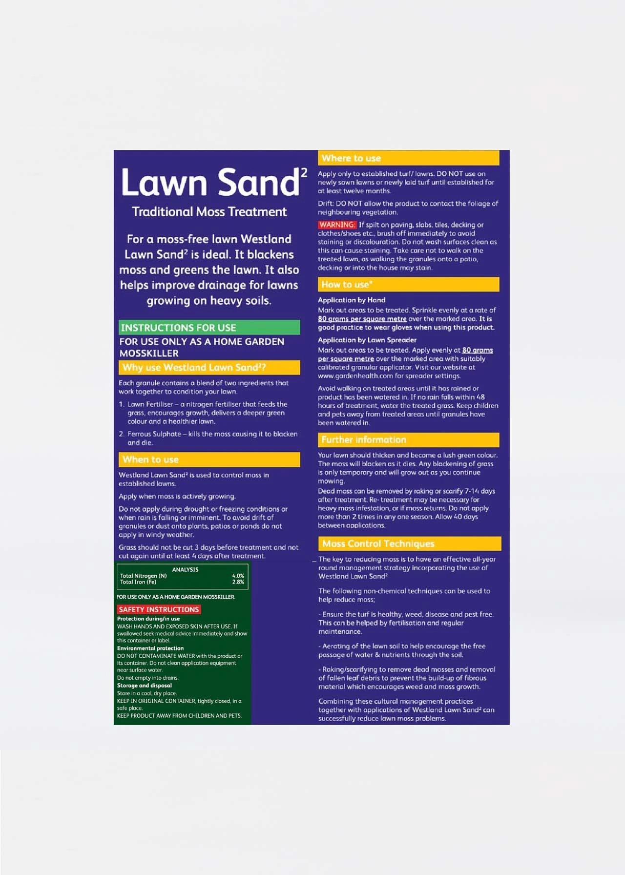 The nitrogen based fertiliser helps to feed the grass while the ferrous sulphate is fast acting and deals with the moss, killing it and turning it black.